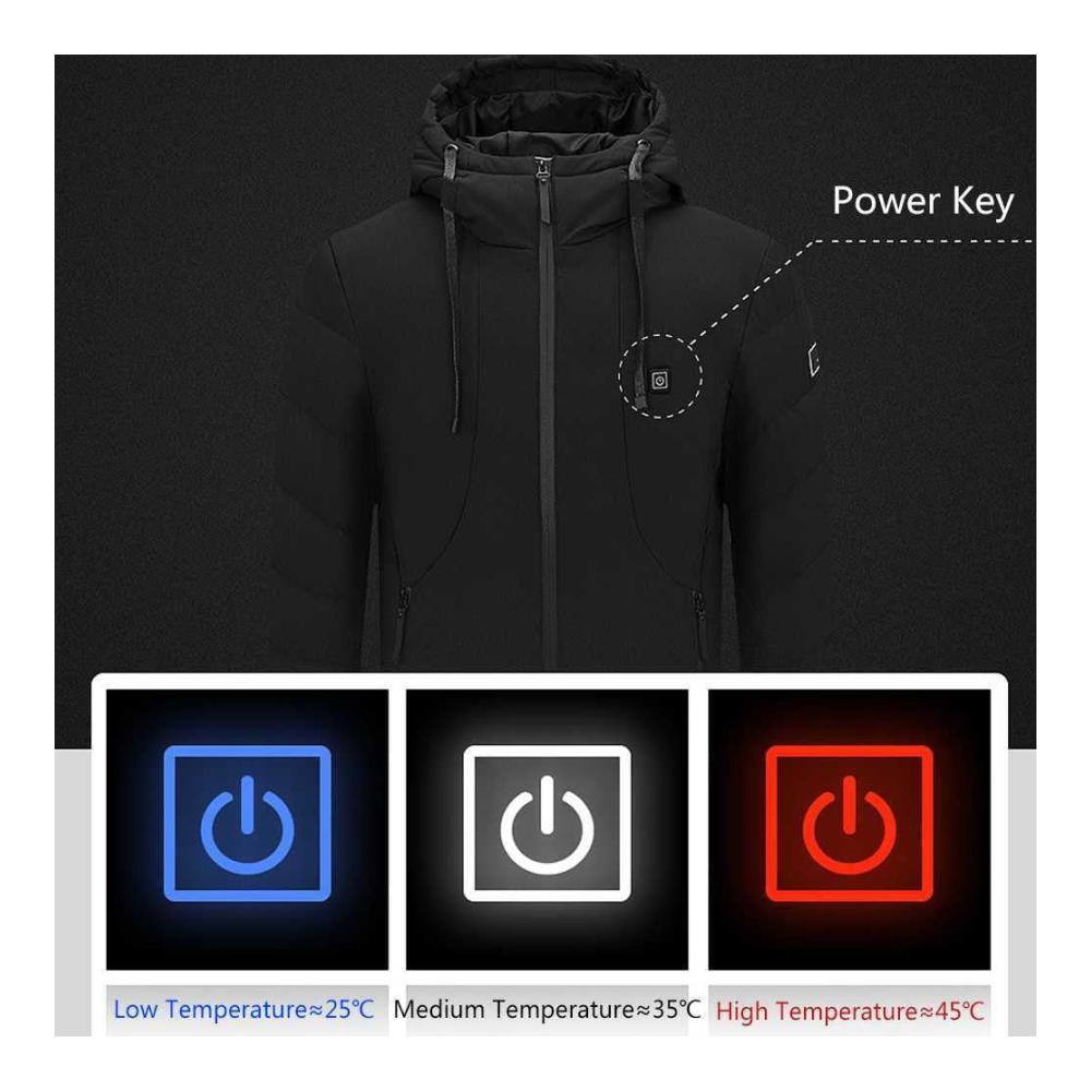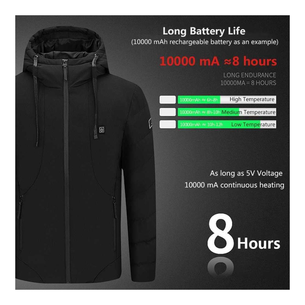 Diese beheizbare Jacke für Herren hält dich auch an den kältesten Tagen warm. Mit 5 Heizungszonen und 3 Temperatureinstellungen kannst du die Wärme genau nach deinen Bedürfnissen anpassen. Der USB-Anschluss lässt dich die Jacke mit einer Powerbank betreiben, sodass du sie auch unterwegs nutzen kannst. Die Kapuze schützt dich vor Wind und Wetter, während die Langarmkonstruktion dich warm hält.