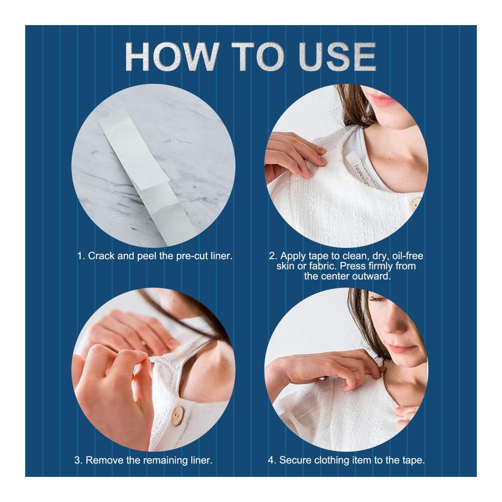 - Fácil De Usar: Solo se necesitan dos simples pasos para usar la cinta para el cuerpo y la ropa fácilmente. 1 Coloque la cinta sobre piel o tela limpia y seca y presione con fuerza desde el centro hacia afuera. 2. Retire el forro restante y fije la ropa en la cinta.