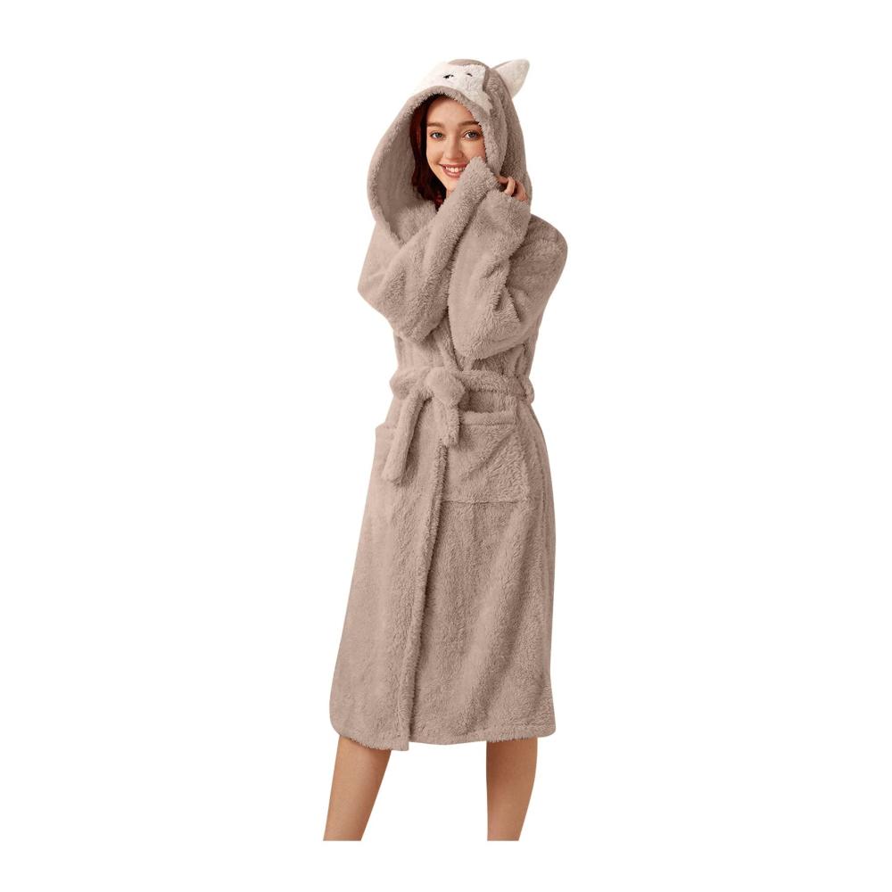 Entdecken Sie unseren exquisiten Damenbademantel, der mit flauschiger Baumwolle für ultimativen Komfort und Wärme gestaltet wurde. Der Bademantel verfügt über niedliche Ohren und eine Kapuze, die ein kuscheliges Erlebnis bieten. Der flauschige Stoff sorgt für ein angenehmes Gefühl auf der Haut, während das leichte Design den perfekten Begleiter für entspannende Momente macht. Egal, ob Sie ihn nach einem entspannten Bad, in der Sauna oder einfach zu Hause tragen, dieser Bademantel vereint Stil und Gemütlichkeit. Gönnen Sie sich Luxus mit unserem flauschigen Kuschelbademantel!