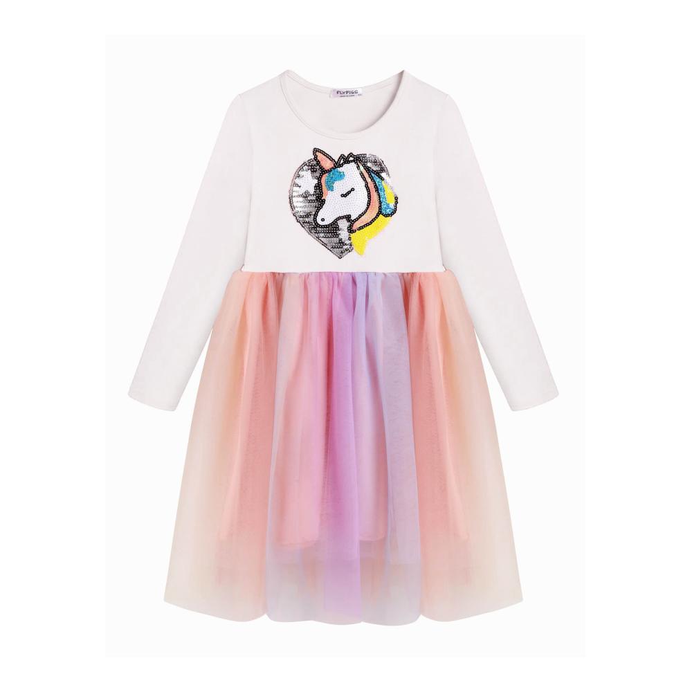 Flypigs Mädchen Prinzessin Kleider Langarm Baumwolle Partykleid Einhorn Pailletten Regenbogen Tüll Geburtstag Partykleid für Kinder 4-10 Jahre