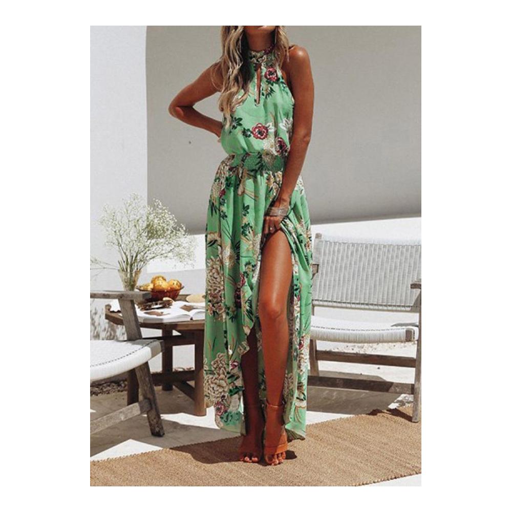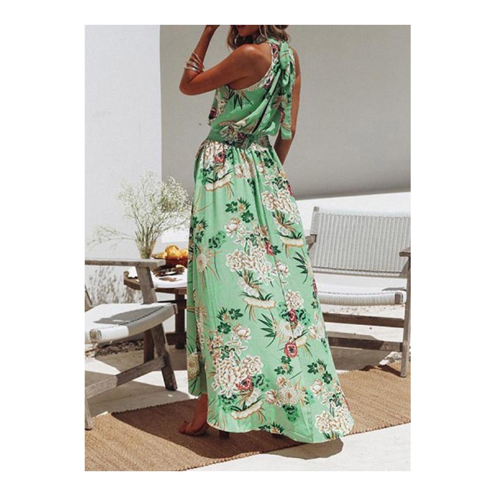 Dieses Party Kleid für Damen ist perfekt für den Sommer. Es ist lang geschnitten und hat einen eleganten Schlitz. Das Kleid ist mit einem Boho Blumenmuster verziert, das perfekt für sonnige Tage am Strand geeignet ist. Es hat einen Neckholder-Ausschnitt, der das Dekolleté vorteilhaft betont. Das asymmetrische Design macht dieses Kleid zu einem echten Hingucker. Es ist vorne kurz geschnitten und hinten lang, was dem Kleid eine besondere Note verleiht. Perfekt für Partys und besondere Anlässe.