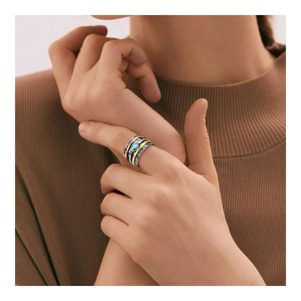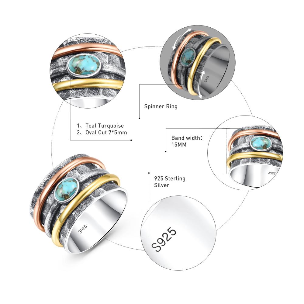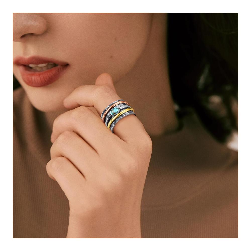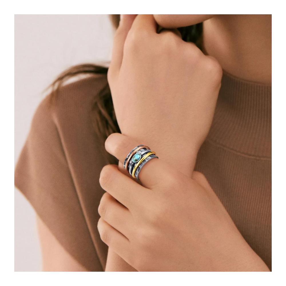 Dieser wunderschöne dreifarbige Silberring (925) mit strukturierter Oberfläche ist der perfekte Boho-Ring für Damen. Der Türkisspinnerring bietet eine beruhigende Möglichkeit, Angstzustände zu lindern und sich zu entspannen. Er ist in verschiedenen Größen erhältlich und passt perfekt zu jedem Anlass.