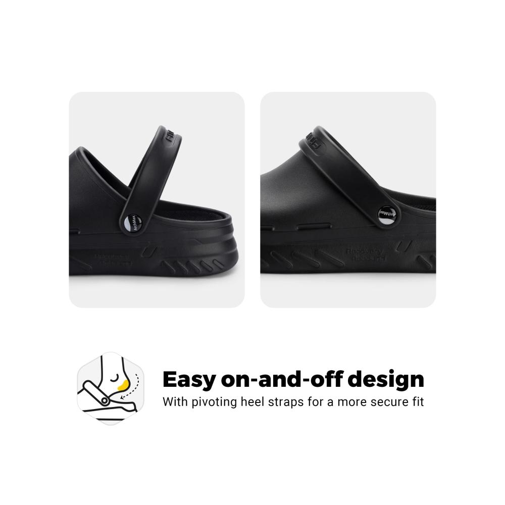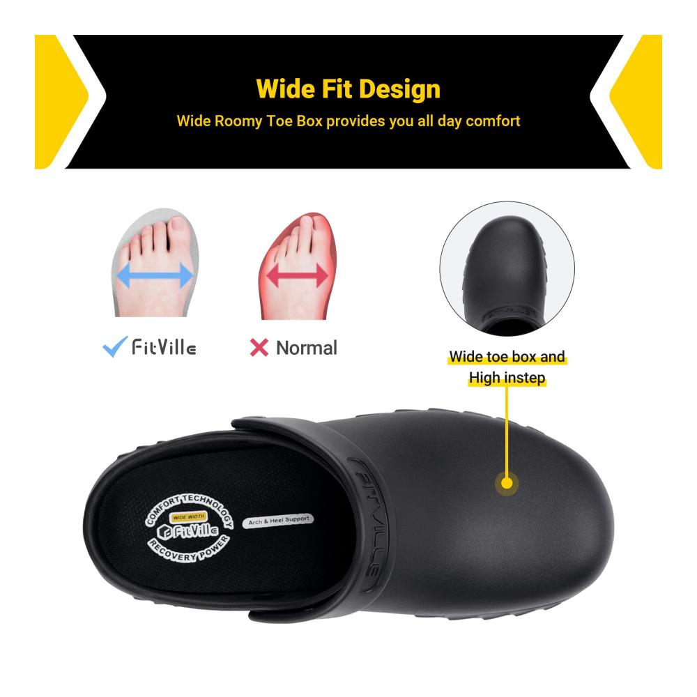 FitVille Recovery Clog mit Slip-on Design für zusätzliche Entspannung im Fußbett. Die ultraleichte Struktur und die stoßdämpfende Zwischensohle mit breiter Zehenbox sorgen für mehr Komfort. Die verbesserte, rutschfeste kreuzförmige Gummiaußensohle bietet festen Halt auf verschiedenen Oberflächen und eine U-förmige Fersenkappe sorgt für noch bessere Stabilisierung. Die FitVille ArchMax-Technologie bietet ein stützendes und gepolstertes Sohlenerlebnis.