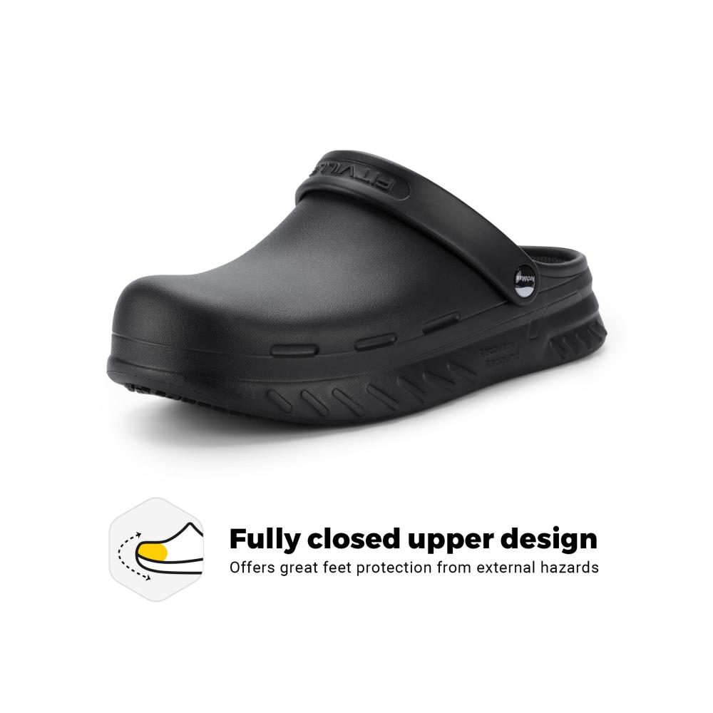 Einfaches An- und Ausziehen mit voll geschlossener Kappe zum Schutz der Füße vor äußeren Gefahren.